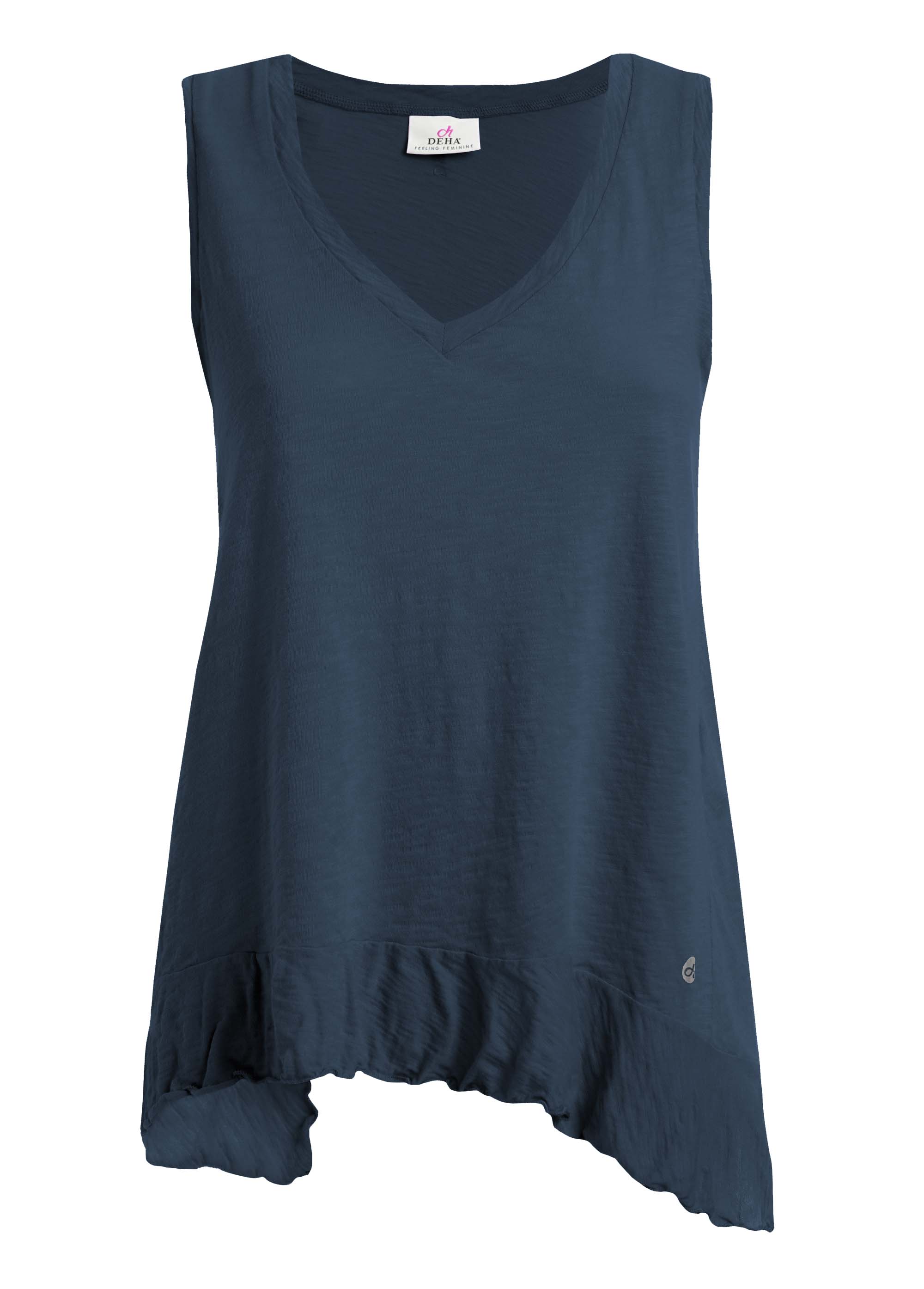 Topul cu volane DEHA - Flamne este perfect pentru activitatile sportive dar si pentru momentele de relaxare. Acesta este confectionat din bumbac 100 % organic, este prietenos cu pielea si mediu. Croiul mai lung in partile laterale din fata si prevazut cu un volan discret in partea de jos face acest top potrivit tinutelor casual si sport.