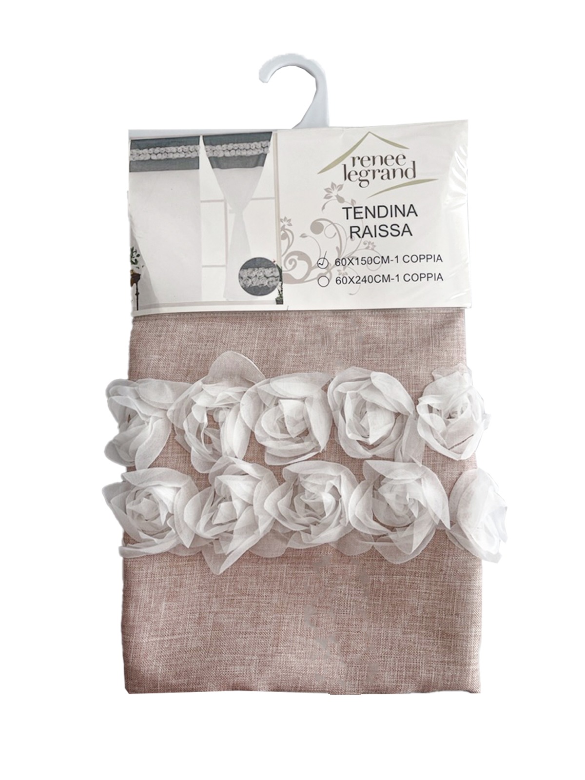 Perdelele Raissa se deosebesc prin textura diafana si a modelului decorativ aplicat. Acestea sunt finisate la capete si pot fi montate imediat cu sistem de prindere pe bara. Perdelele Raissa se potrivesc in living datorita gradului de opacitate redus care permite intrarea luminii naturale intr-un mod delicat Aceste perdele dau un aer rafinat datorita aplicatiilor in forma de trandafir si a culorii pastelate din partea superioara.
