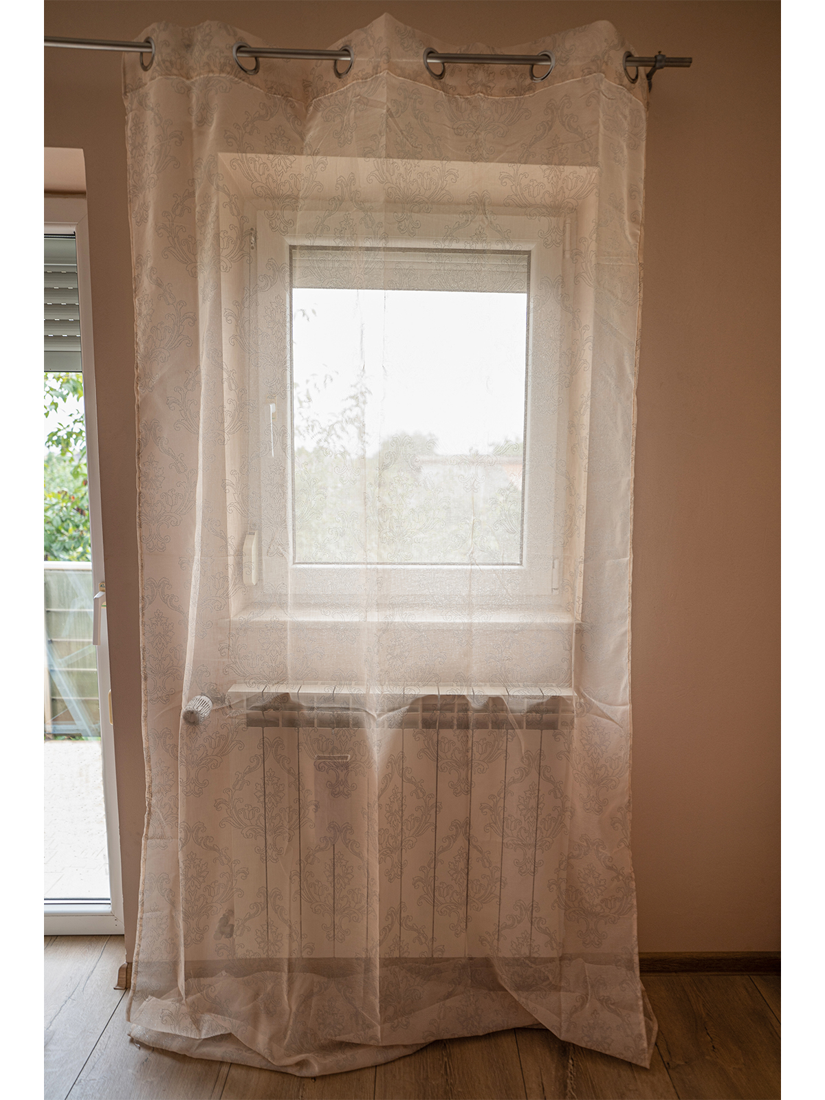 Perdelele Zelia se deosebesc prin nota de eleganta pe care o ofera incaperii datorita sistemului de prindere in inele, a texturii diafane si a modelului decorativ. Acestea sunt finisate la capete si pot fi montate imediat. Perdelele Zelia se potrivesc in dormitor dar si in living ele oferind o atmosfera extraordinar de eleganta datorita lungimii pana la podea.