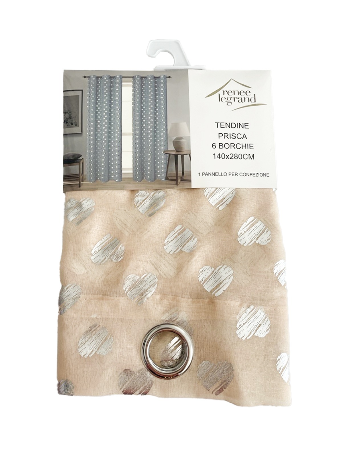 Perdelele Prisca se deosebesc prin nota de eleganta pe care o ofera incaperii datorita sistemului de prindere in inele, a texturii diafane si a modelului decorativ cu inimi argintii. Acestea sunt finisate la capete si pot fi montate imediat. Perdelele Prisca se potrivesc in dormitor dar si in living ele oferind o atmosfera extraordinar de eleganta datorita lungimii pana la podea.
