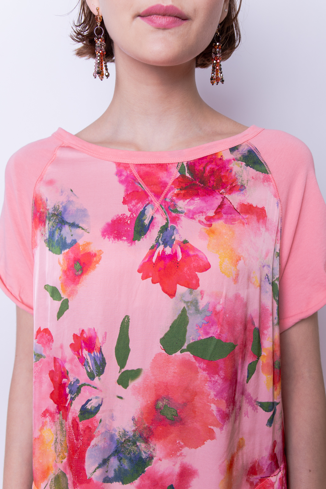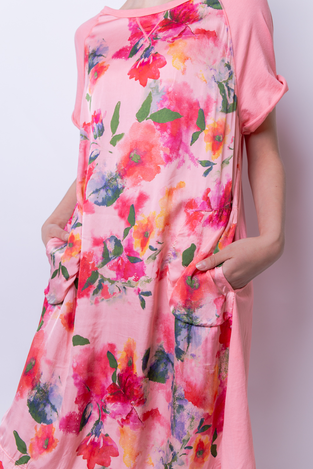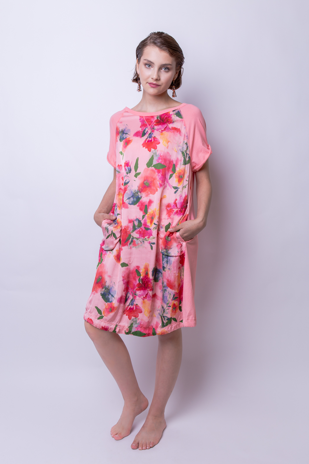 Rochie roz florala Deha este confectionata din vascoza si bumbac, este vaporoasa si iti da un aer feminin datorita printului. Aceasta rochie este extraordinar de confortabila si racoroasa putand fi asortata usor la sandale dar si la incaltaminte sport. Rochia are un cordon in partea de jos, care ii poate schimba caderea.