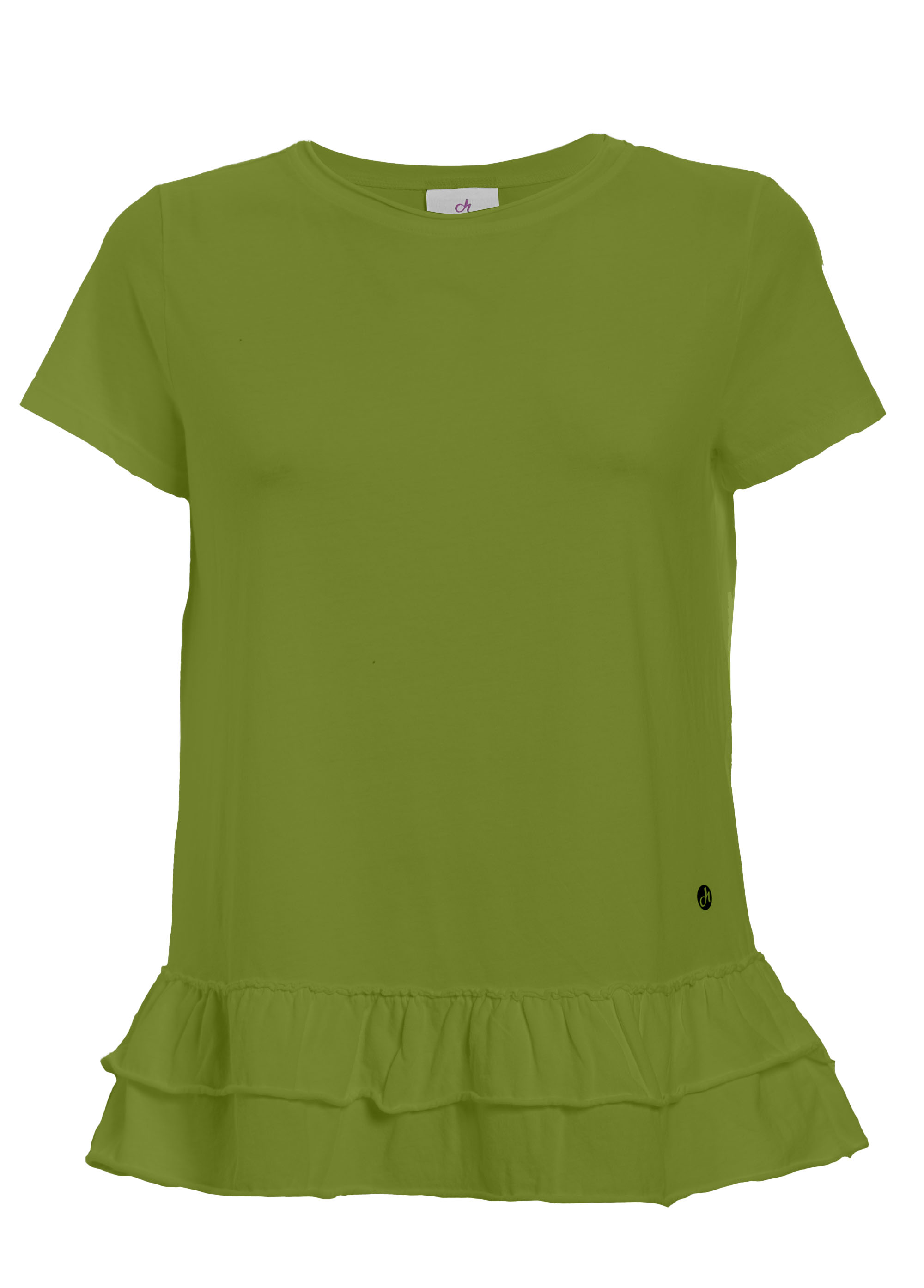 Tricoul olive din bumbac organic DEHA este simplu si de efect. Materialul natural din care este realizat, bumbac organic, iti da incredere in ceea ce porti si iti lasa pielea sa respire. Tricoul are in partea de jos niste volane discrete iar acest aspect ii da o nota feminina.